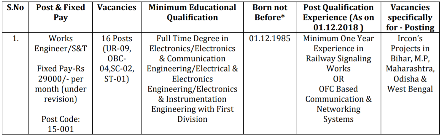 Indian Railway Construction Company Limited (IRCON), invites applications for the recruitment of Works Engineer/ S&T on Contract basis for Ircon’s various projects for 01 years at a fixed all-inclusive salary. The eligibility criteria and other details are tabulated below:
