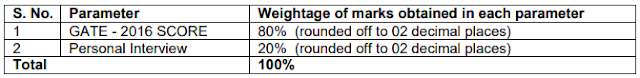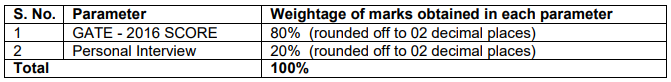 Selection Process: Separate merit list will be drawn for UR/SC/ST/OBC/PwBD candidates with reference to the number of available vacancies for each category. Merit list of suitable candidates shall be prepared on the basis of GATE 2016 Score as well as personal interview. The following weightages shall be assigned to the parameters as under: